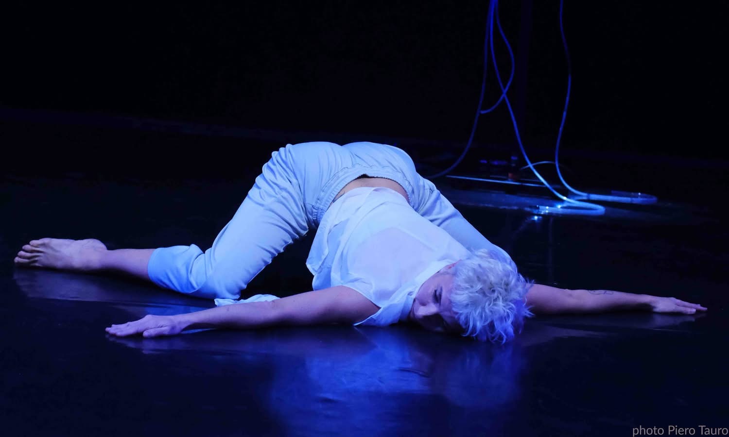 I cavi, sono elementi centrali nell’architettura dello spazio performativo, sono gomitoli di fili di Arianna, conduttori elettrici interrotti che delimitano e determinano lo spazio di azione.